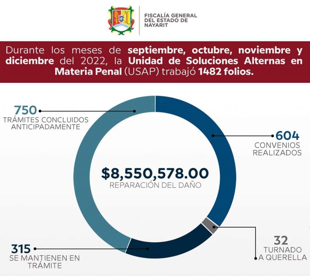 La Unidad de Soluciones Alternas en Materia Penal (USAP) de Fiscalía General de Nayarit, durante los pasados meses de septiembre, octubre, noviembre y diciembre intervino en un total de 1482 convenios entre partes, los cuales se formalizaron en las propias oficinas de USAP en Tepic, en el Centro de la Mujer de la capital del estado, en los municipios de Santiago Ixcuintla, Xalisco, Acaponeta y Tecuala, así como en las localidades de Valle de Banderas, Bucerías y Jarretaderas, además del Centro Regional de Bahía de Banderas.