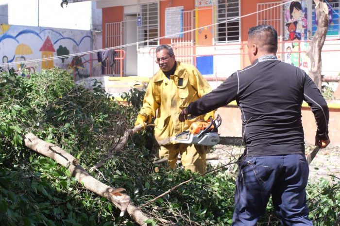 Durante las acciones los elementos de Protección Ciudadana y Bomberos, acudieron a la escuela José María Martínez, donde el personal cortó dos (2) árboles, que por su altura presentaran riesgo para la comunidad estudiantil y docentes.