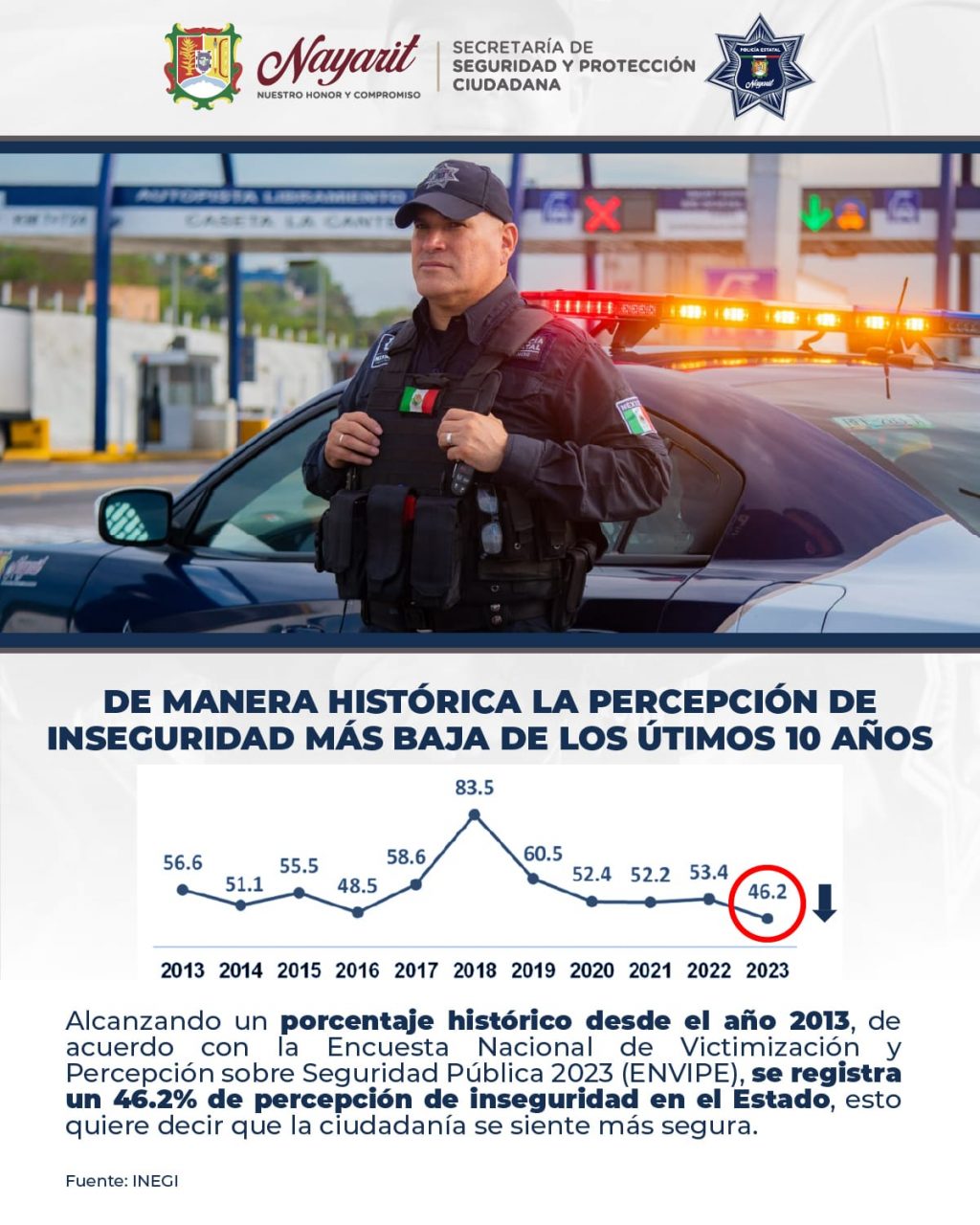 Alcanzando un porcentaje histórico desde el año 2013, de acuerdo con la Encuesta Nacional de Victimización y Percepción sobre Seguridad Pública 2023 (ENVIPE), se registra un 46.2% de percepción de inseguridad en el Estado, esto quiere decir que la ciudadanía se siente más segura en Nayarit.