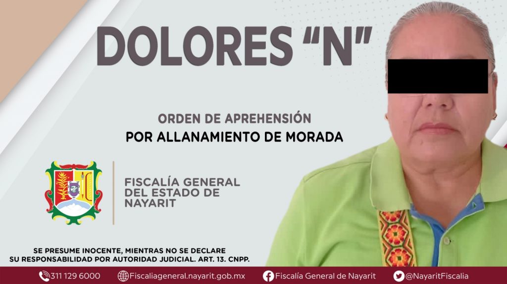 Elementos de la Agencia de Investigación Criminal de Nayarit ejecutaron una orden de aprehensión en el municipio de Ruiz contra Dolores “N”, por su presunta participación en hechos que según apreciación de la ley encuadran el delito de allanamiento de morada, cometido en agravio de una persona de sexo femenino de identidad reservada.