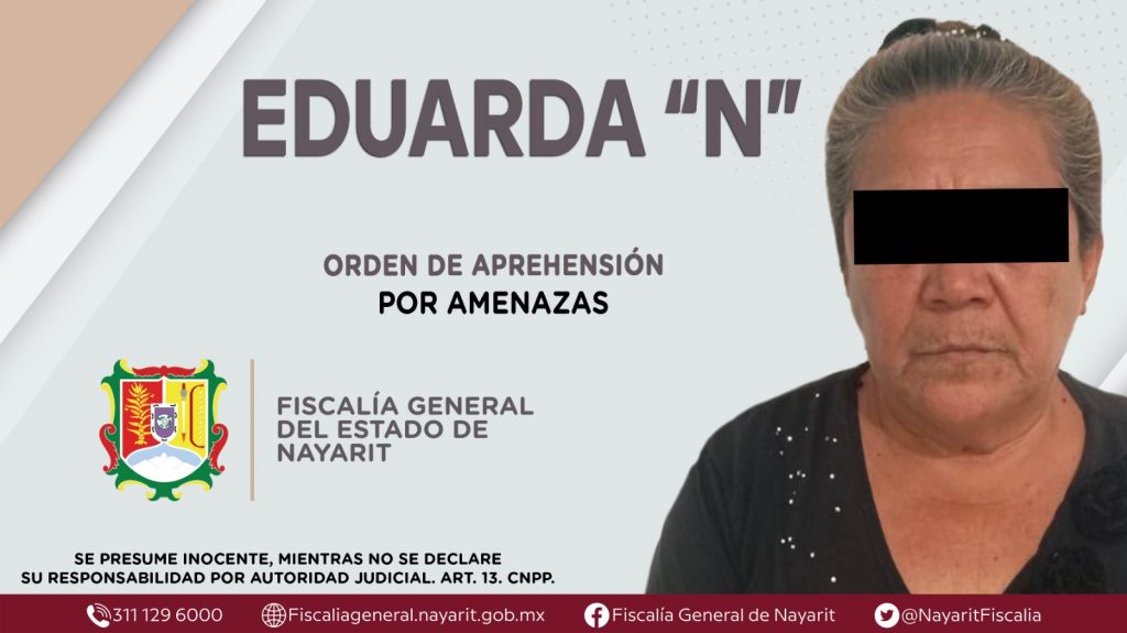 Elementos de la Agencia de Investigación Criminal de Nayarit ejecutaron una orden de aprehensión en la localidad La Presa, municipio de Santiago Ixcuintla contra Eduarda “N”, por su presunta participación en hechos que según apreciación de la ley configuran el delito de amenazas, cometido contra una mujer de identidad reservada.
