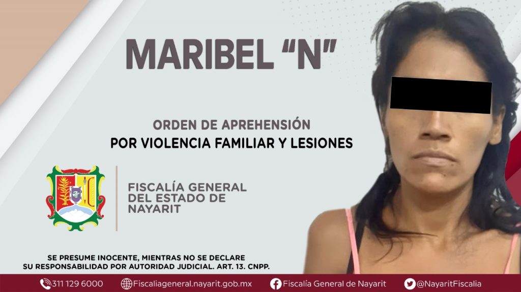 En el municipio de San Blas, elementos de la Agencia de Investigación Criminal dieron cumplimiento a una orden de aprehensión que se obsequió contra Maribel “N”, por su probable participación en hechos que la ley califica como delitos de violencia familiar y lesiones, cometidos en agravio de una persona de sexo femenino cuya identidad se reserva.
