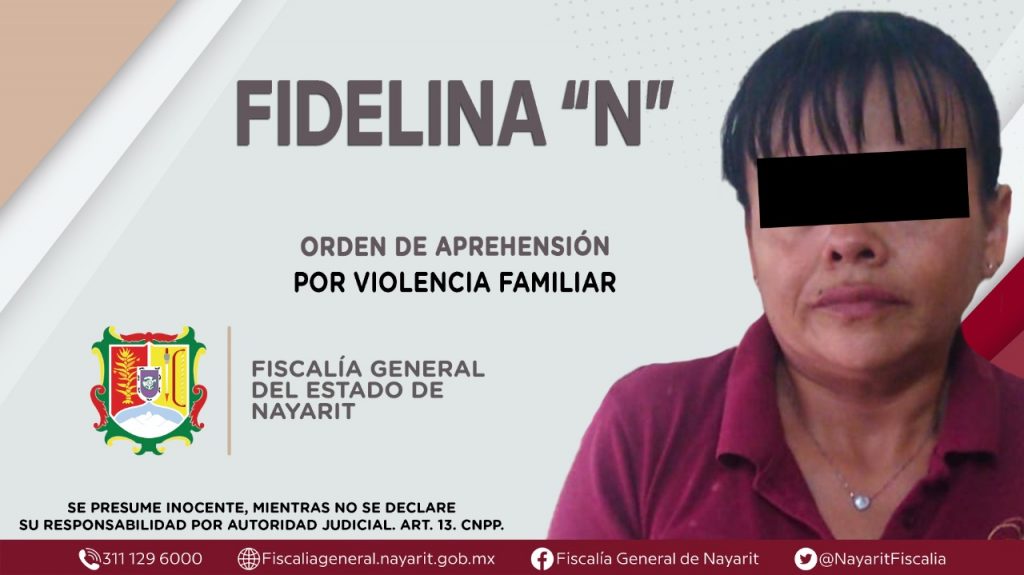 La Fiscalía General de Nayarit a través de la Agencia de Investigación Criminal ejecutó una orden de aprehensión en la localidad Los Ayala, municipio de Compostela contra Fidelina “N”, originaria del estado de Michoacán y vecina de la localidad Zacualpan, Compostela, por su presunta participación en hechos que según apreciación de la ley encuadran el delito de violencia familiar, cometido en agravio de un menor de edad de identidad reservada.