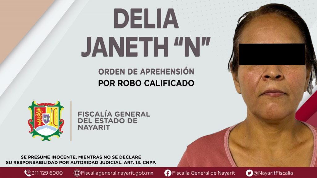 Elementos de la Agencia de Investigación Criminal dieron cumplimiento a una orden de aprehensión en la ciudad de Tepic contra Delia Janeth “N”, por su presunta participación en hechos que bajo la apreciación de la ley configuran el delito de robo calificado, cometido en agravio de una persona de sexo femenino de identidad reservada.