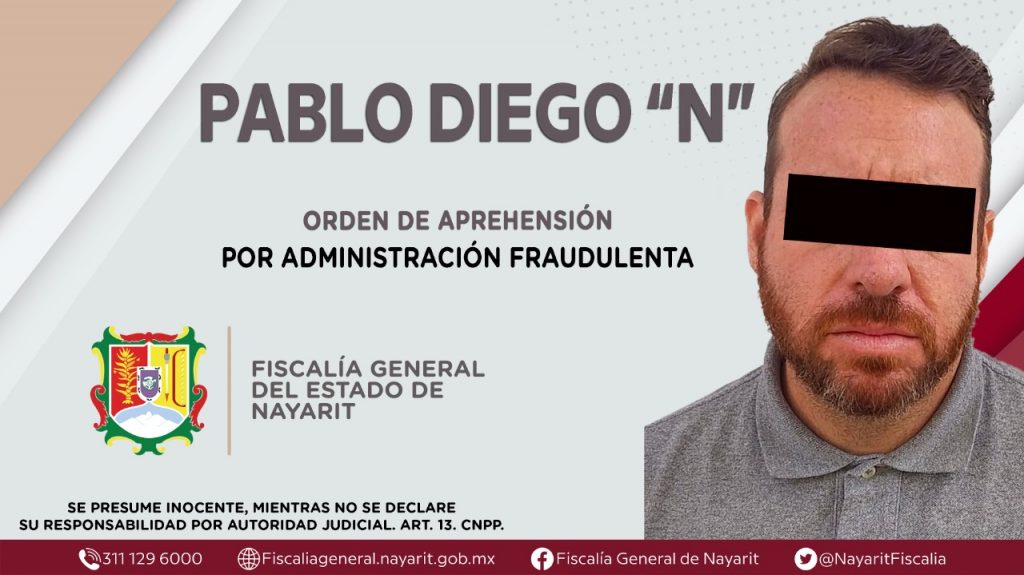 La Fiscalía General del estado a través de la Agencia de Investigación Criminal, dio cumplimiento a una orden de aprehensión en el municipio de Bahía de Banderas contra Pablo Diego “N”, por su probable participación en hechos que según la ley configuran el delito de administración fraudulenta, cometido en agravio de una persona de sexo femenino cuya identidad es reservada.