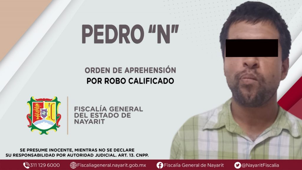 Elementos de la Agencia de Investigación Criminal ejecutaron una orden de aprehensión en el municipio de Bahía de Banderas contra Pedro “N”, quien es originario del estado de Michoacán y vecino del municipio de Bahía de Banderas-, por su presunta participación en hechos que según apreciación de la ley encuadran el delito de robo calificado.