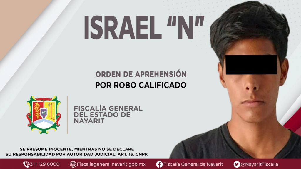 La Fiscalía General del Estado a través de la Agencia de Investigación Criminal dio cumplimiento a una orden de aprehensión en el municipio de Bahía de Banderas contra Israel “N”, por su presunta participación en hechos que bajo la apreciación de la ley configuran el delito de robo calificado, cometido en agravio de una persona de sexo femenino de identidad reservada.