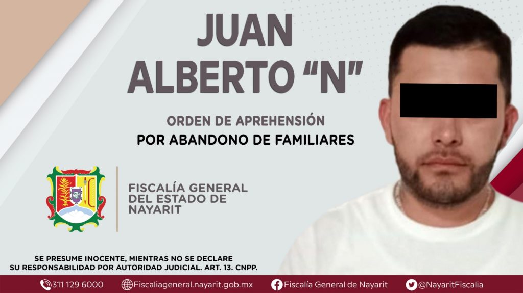 La Fiscalía General de Nayarit a través de la Agencia de Investigación Criminal dio cumplimiento a una orden de aprehensión en el municipio de Compostela contra Juan Alberto “N”, por su presunta participación en hechos que según apreciación de la ley encuadran el delito de abandono de familiares, cometido en agravio de una persona menor de dieciocho años de identidad reservada.