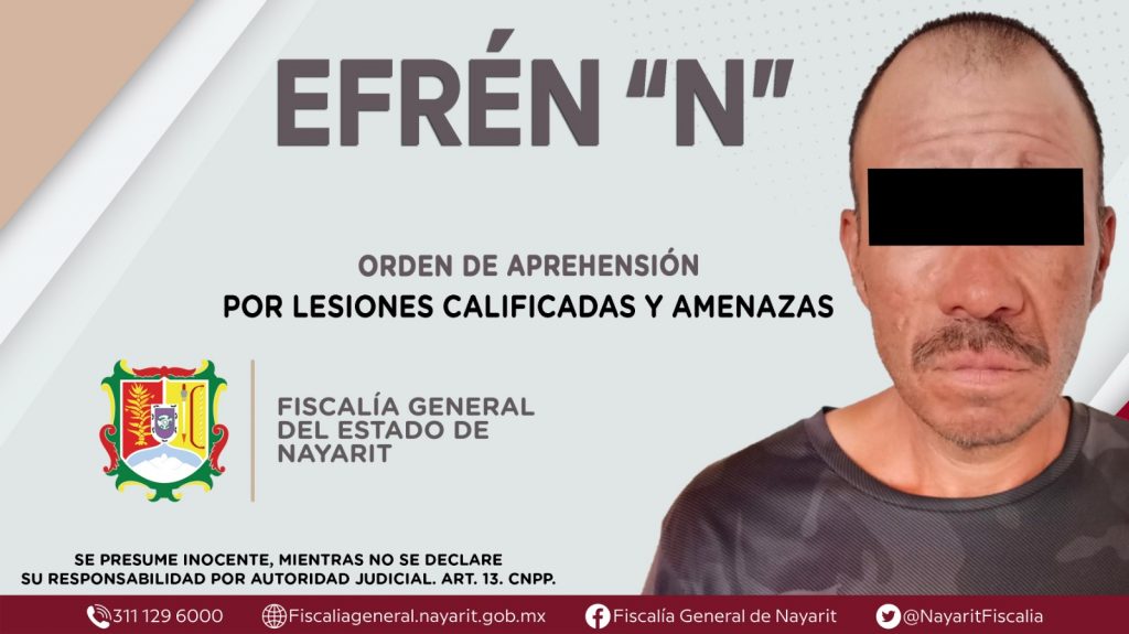 Elementos de la Agencia de Investigación Criminal de Nayarit ejecutaron una orden de aprehensión en la localidad Juan Escutia “El Borbollón”, municipio de Compostela contra Efrén “N”, por su presunta participación en hechos que según interpretación de la ley encuadran los delitos de lesiones calificadas y amenazas, cometidos en agravio de una persona de sexo masculino de identidad reservada.