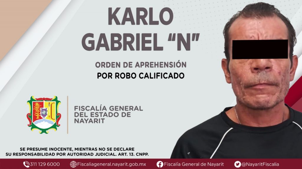 La Fiscalía General del estado a través de la Agencia de Investigación Criminal, dio cumplimiento a una orden de aprehensión en la ciudad de Tepic contra Karlo Gabriel “N”, por su probable participación en hechos que la ley conceptúa como delito de robo calificado, cometido en perjuicio de una persona de sexo masculino de identidad reservada.