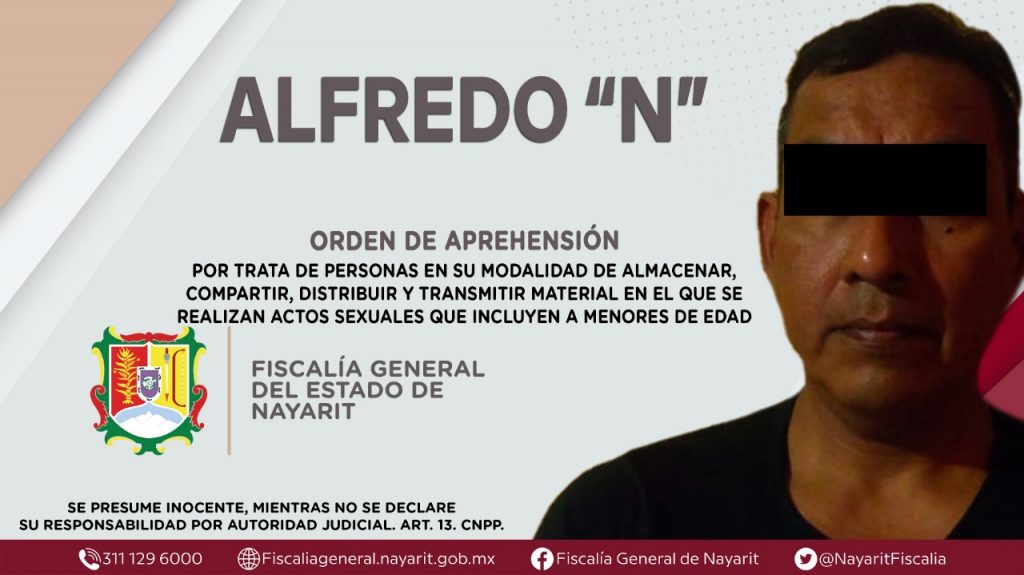 Elementos de la Agencia de Investigación Criminal dieron cumplimiento a una orden de aprehensión en la localidad Las Varas, municipio de Compostela contra Alfredo “N”, quien es originario y vecino del lugar donde fue detenido, por su presunta participación en hechos que bajo la apreciación de la ley configuran el delito de trata de personas en su modalidad de almacenar, compartir, distribuir y transmitir material en el que se realizan actos sexuales que incluyen a menores de edad -pornografía infantil-.