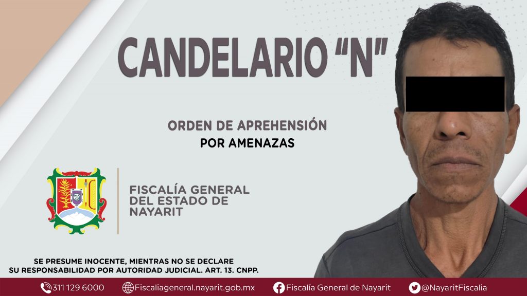 La Fiscalía General del Estado a través de la Agencia de Investigación Criminal cumplimentó una orden de aprehensión en el municipio de Santiago Ixcuintla contra Candelario “N”, por su presunta participación en hechos que bajo apreciación de la ley configuran el delito de amenazas, cometido en agravio de una mujer cuya identidad se reserva.