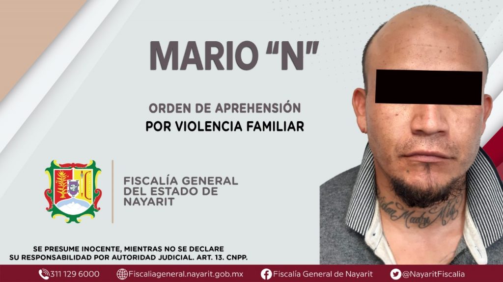 La Fiscalía General del estado a través de la Agencia de Investigación Criminal, dio cumplimiento a una orden de aprehensión en la ciudad de Tepic contra Mario “N”, por su probable participación en hechos que la ley conceptúa como delito de violencia familiar, cometido en agravio de una persona de sexo femenino cuya identidad es reservada.