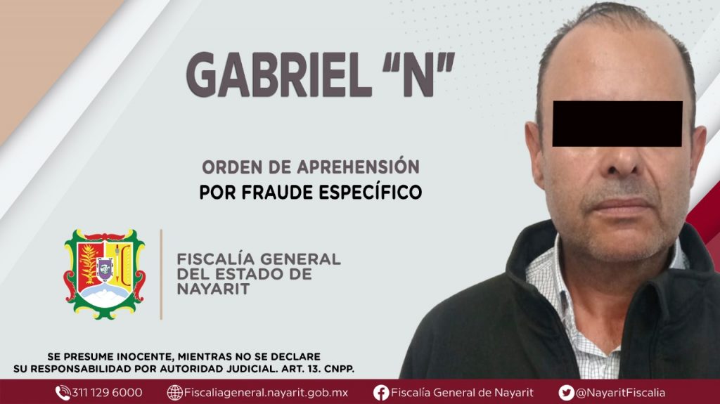 Con la colaboración de la Fiscalía General del estado de Jalisco, elementos de la Agencia de Investigación Criminal de Nayarit ejecutaron una orden de aprehensión en Zapopan, Jalisco contra Gabriel “N”, quien es originario de Pátzcuaro, Michoacán y vecino del primer lugar, por su presunta participación en hechos que según apreciación de la ley encuadran el delito de fraude específico, cometido en agravio de Agroindustrias de Michoacán, Sociedad Anónima de Capital Variable.