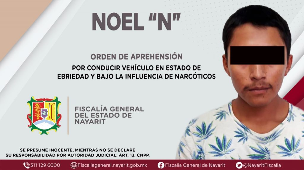La Fiscalía General de Nayarit a través de la Agencia de Investigación Criminal ejecutó en la ciudad de Tepic una orden de aprehensión contra Noel “N”, por su presunta participación en hechos que según apreciación de la ley encuadran el delito de tránsito ejecutado por conductores de vehículos en sus modalidades de conducir en estado de ebriedad y bajo la influencia de narcóticos, ilícito cometido en perjuicio de la sociedad.