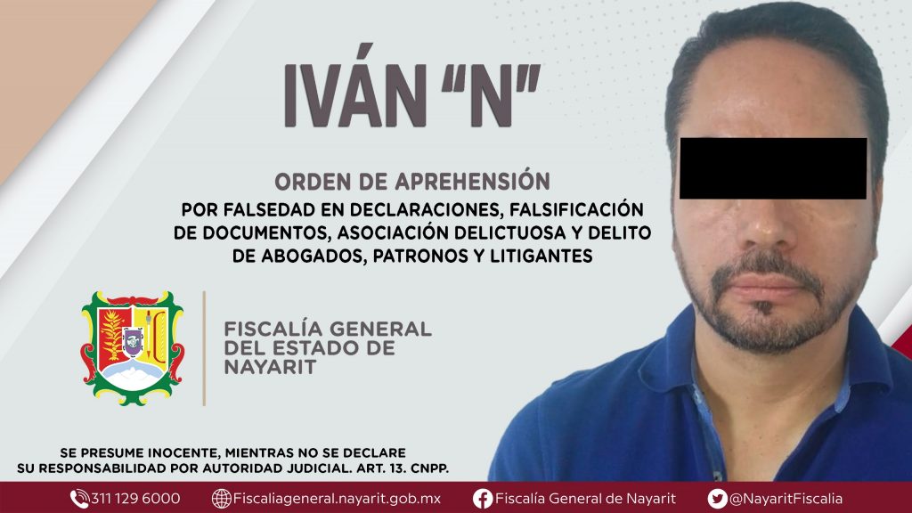 Elementos de la Agencia de Investigación Criminal de Nayarit ejecutaron una orden de aprehensión en el municipio de Ahuacatlán contra Iván “N”, por su presunta participación en hechos que según apreciación de la ley encuadran los delitos de abogados, patronos y litigantes, falsedad en declaraciones judiciales e informes dados a una autoridad, falsificación de documentos en general y asociación delictuosa, cometidos en agravio de persona de sexo masculino de identidad reservada.