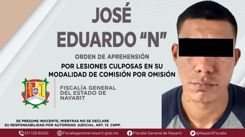 Elementos de la Agencia de Investigación Criminal de Nayarit ejecutaron una orden de aprehensión en la ciudad de Tepic contra José Eduardo “N”, por su presunta participación en hechos que según apreciación de la ley encuadran el delito de lesiones culposas en su modalidad de comisión por omisión, cometido en contra de una persona de sexo masculino de identidad reservada.