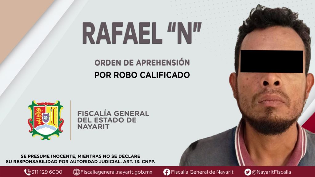 La Fiscalía General del Estado a través de la Agencia de Investigación Criminal dio cumplimiento a una orden de aprehensión en la ciudad de Tepic contra Rafael “N”, por su presunta participación en hechos que según apreciación de la ley configuran el delito de robo calificado, ilícito cometido en agravio de la Secretaría de Infraestructura del estado de Nayarit.