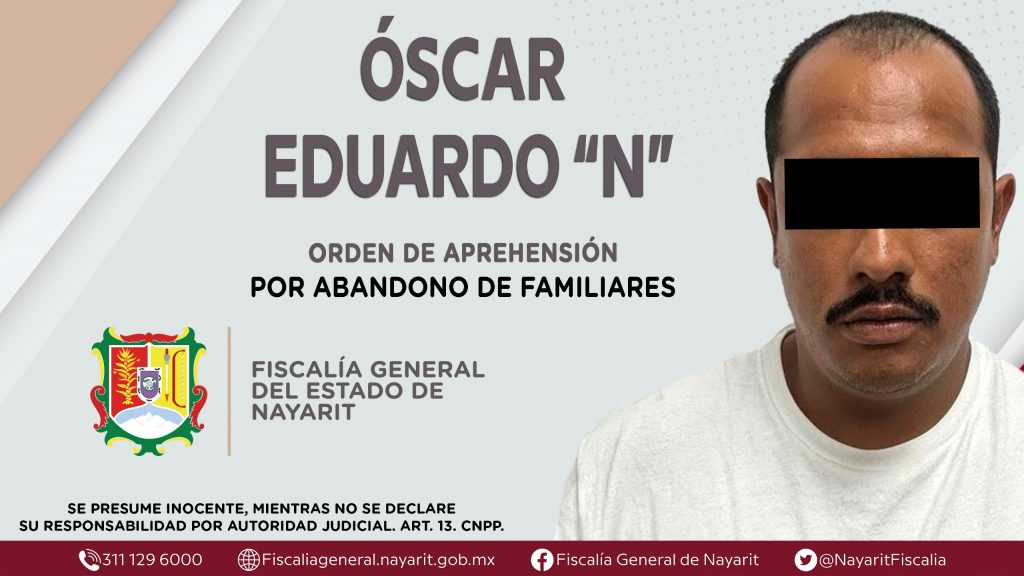 La Fiscalía General del Estado a través de la Agencia de Investigación Criminal dio cumplimiento a una orden de aprehensión en la ciudad de Tepic contra Óscar Eduardo “N”, por su presunta participación en hechos que según apreciación de la ley encuadran el delito de abandono de familiares, cometido en agravio de un niño de identidad reservada.