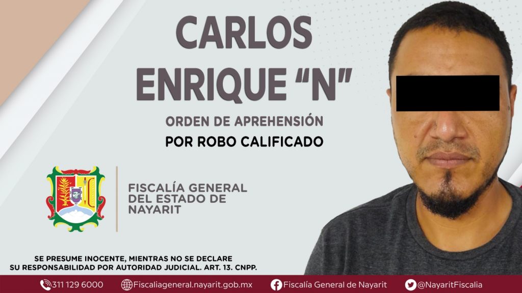 Elementos de la Agencia de Investigación Criminal de Nayarit ejecutaron una orden de aprehensión en la ciudad de Tepic contra Carlos Enrique “N”, por su presunta participación en hechos que según apreciación de la ley encuadran el delito de robo calificado, en perjuicio de una persona de sexo masculino de identidad reservada.