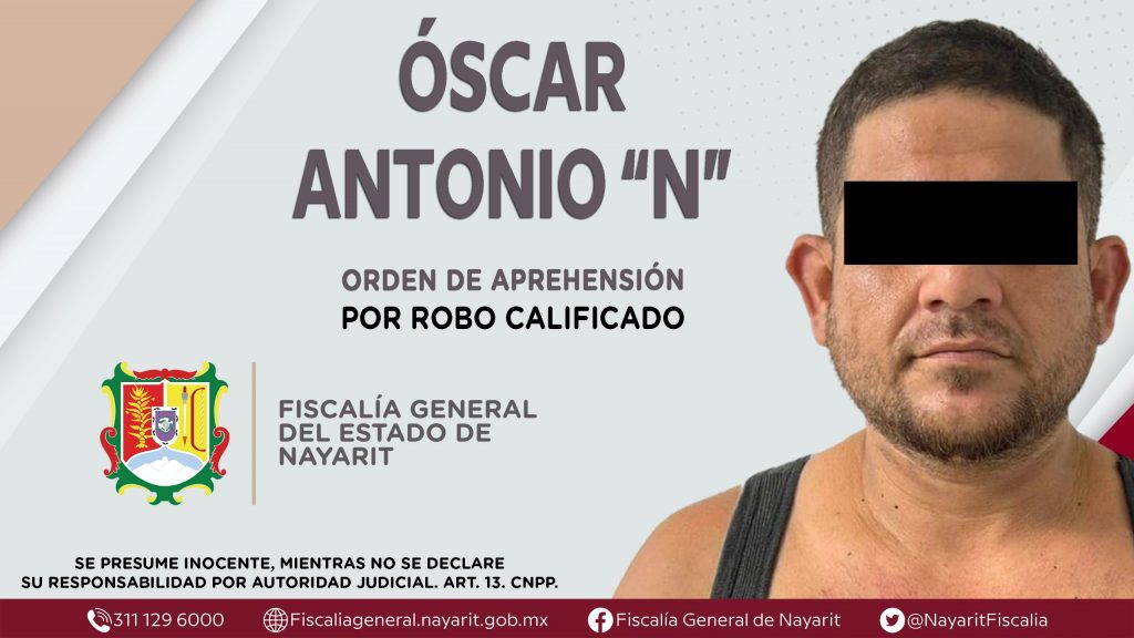La Fiscalía General del Estado a través de la Agencia de Investigación Criminal dio cumplimiento a una orden de aprehensión en la ciudad de Tepic contra Óscar Antonio “N”, por su presunta participación en hechos que según apreciación de la ley configuran el delito de robo calificado, cometido en perjuicio de dos personas -una de sexo masculino y otra de sexo femenino-, ambas de identidades reservadas.