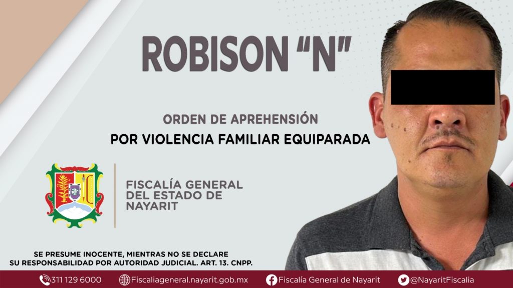 La Fiscalía General del Estado a través de la Agencia de Investigación Criminal dio cumplimiento a una orden de aprehensión en la ciudad de Tepic contra Robison “N”, por su presunta participación en hechos que según apreciación de la ley configuran el delito de violencia familiar equiparada, cometido en agravio de una persona de sexo femenino de identidad reservada.