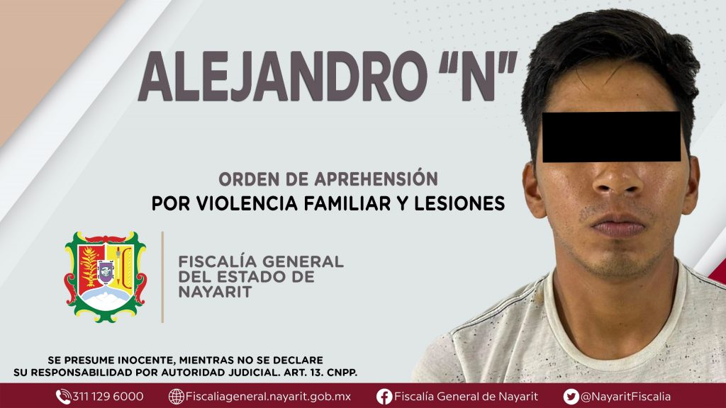 La Fiscalía General del Estado a través de la Agencia de Investigación Criminal dio cumplimiento a una orden de aprehensión en la ciudad de Tepic contra Alejandro “N”, por su presunta participación en hechos que según apreciación de la ley encuadran los delitos de violencia familiar y lesiones, cometido en agravio de una persona de sexo femenino de identidad de una mujer.
