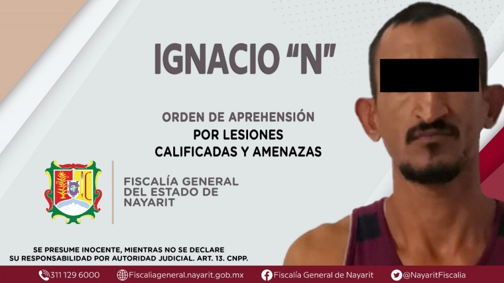 La Fiscalía General de Nayarit a través de la Agencia de Investigación Criminal ejecutó una orden de aprehensión en el municipio de Bahía de Banderas contra Ignacio “N”, originario del municipio de Tomatlán, Jalisco y vecino de la localidad Sayulita, por su presunta participación en hechos que según apreciación de la ley encuadran los delitos de lesiones calificadas y amenazas, cometidos en agravio de una persona de sexo femenino quien es hermana del aprehendido.