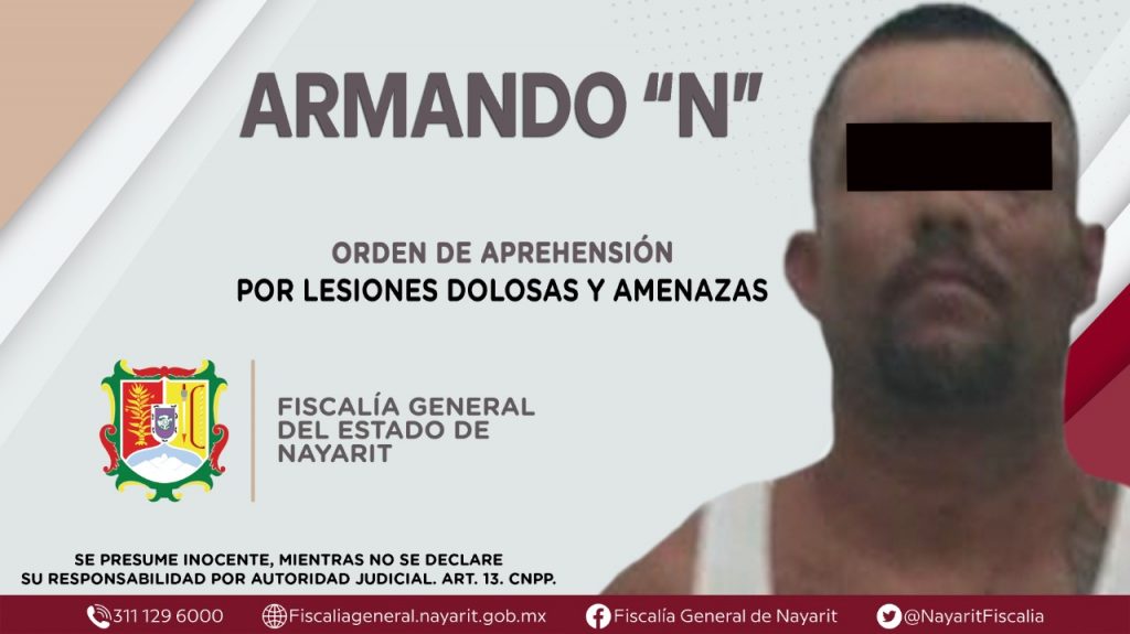 En la localidad Rincón de Guayabitos, municipio de Compostela, elementos de la Agencia de Investigación Criminal dieron cumplimiento a una orden de aprehensión que se obsequió contra Armando “N”, por su probable participación en hechos que la ley califica como delitos de lesiones dolosas y amenazas, cometidos en contra de una persona de sexo masculino cuya identidad se reserva.
