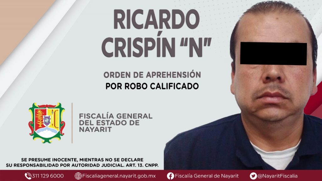 La Fiscalía General de Nayarit a través de la Agencia de Investigación Criminal ejecutó una orden de aprehensión en la ciudad de Tepic contra Ricardo Crispín “N”, por su presunta participación en hechos que según apreciación de la ley encuadran el delito de robo calificado, cometido en perjuicio de una persona de sexo masculino de identidad reservada.