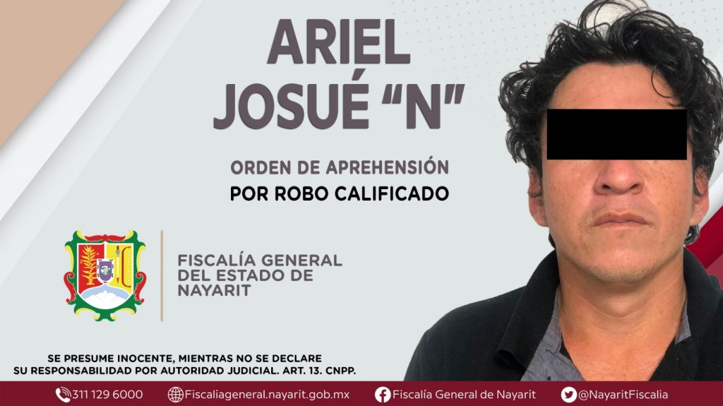 La Fiscalía General del Estado a través de la Agencia de Investigación Criminal cumplimentó una orden de aprehensión en la capital nayarita contra Ariel Josué “N”, por su presunta participación en hechos que bajo la apreciación de la ley configuran el delito de robo calificado, cometido en agravio de una persona de sexo masculino de identidad reservada.