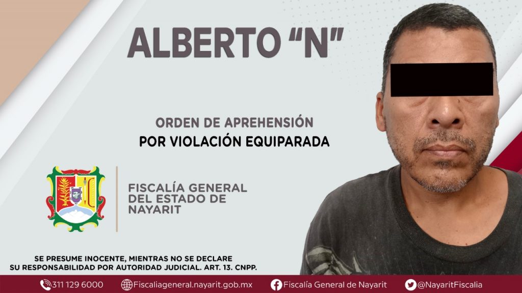Elementos de la Agencia de Investigación Criminal dieron cumplimiento a una orden de aprehensión en la ciudad de Tepic contra Alberto “N”, por su presunta participación en hechos que la ley juzga como delito de violación equiparada, cometido en agravio de una menor de edad cuya identidad se reserva.