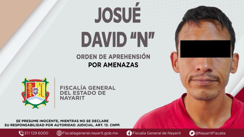 La Fiscalía General del Estado a través de la Agencia de Investigación Criminal dio cumplimiento a una orden de aprehensión en la ciudad de Tepic contra Josué David “N”, por su presunta participación en hechos que según valoración de la ley configuran el delito de amenazas, cometido en agravio de una persona de sexo masculino de identidad reservada.