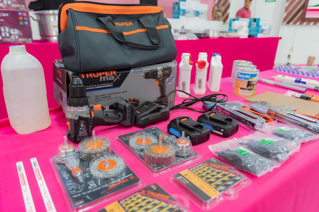 Entre el equipo entregado, destacan insumos de carpintería como martillos, taladros, y thinner; un horno, moldes, básculas, corta galletas y cilindros de gas para los cursos de cocina y repostería; en lo que respecta a corte y confección se equipó con planchas, secadoras, maniquís, máquinas de coser caseras e industriales, así como varios productos para manualidades, decoración con globos y cultora de belleza.