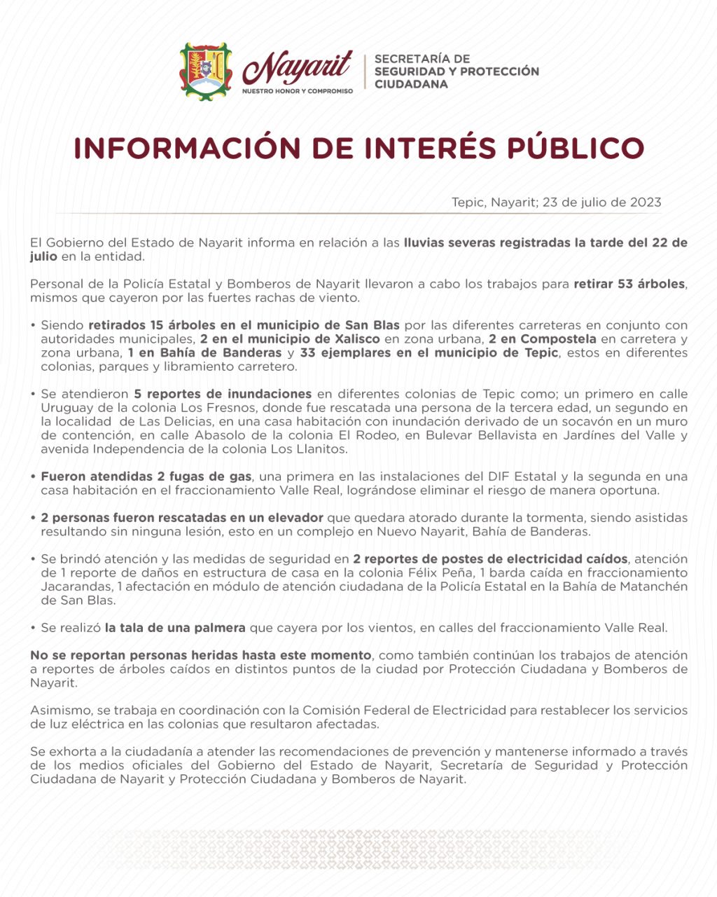 Se exhorta a la ciudadanía a atender las recomendaciones de prevención y mantenerse informado a través de los medios oficiales del Gobierno del Estado de Nayarit, Secretaría de Seguridad y Protección Ciudadana de Nayarit y Protección Ciudadana y Bomberos de Nayarit.