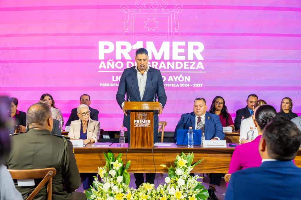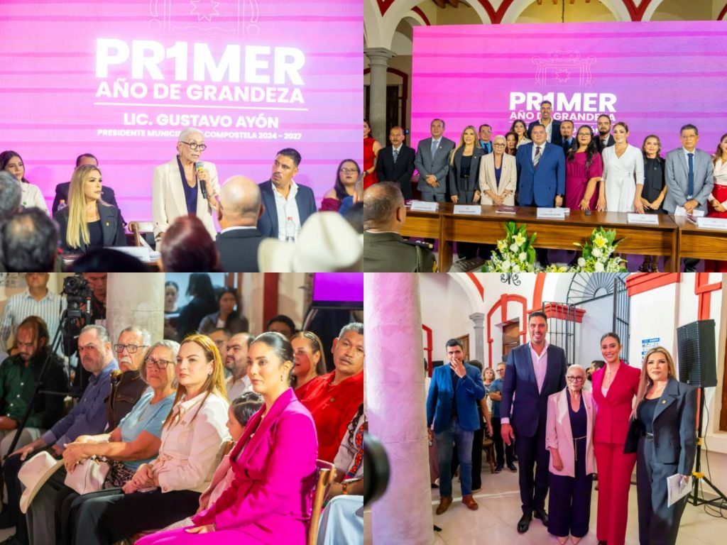 La presidenta del Sistema DIF Nayarit, doctora Beatriz Estrada Martínez, acudió en representación de su esposo, el gobernador del estado, Miguel Ángel Navarro Quintero, a la presentación del Primer Informe de Actividades del presidente municipal de Compostela, Gustavo Alfonso Ayón Aguirre.