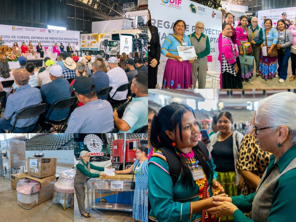Para fortalecer la economía familiar en la entidad, la presidenta del Sistema DIF Nayarit, doctora Beatriz Estrada Martínez, encabezó la clausura de cursos de capacitación y la entrega de proyectos productivos, reconocimientos y apoyos dirigidos a beneficiarios del Programa de Trabajadores Agrícolas Temporales México–Canadá (PTAT) y del Subprograma Repatriados Trabajando en Nayarit. Durante este encuentro se reconoció el esfuerzo de quienes se preparan, emprenden y trabajan para construir un futuro más estable.
