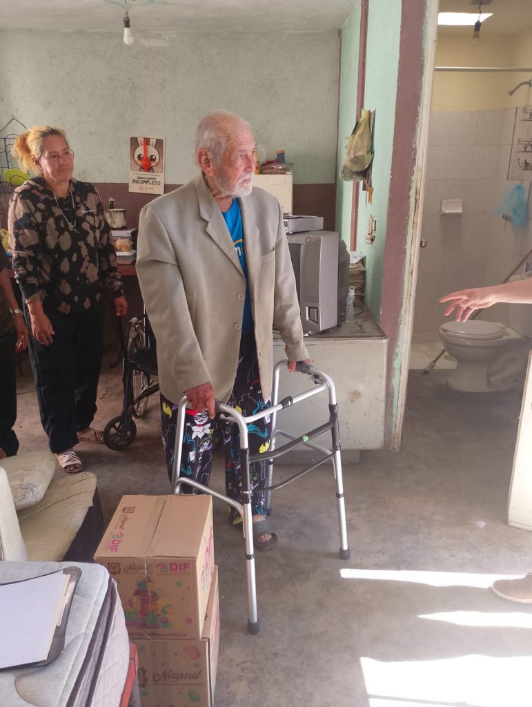 Gracias a la sensibilidad y compromiso de la doctora Beatriz Estrada Martínez, presidenta del Sistema DIF Nayarit, la institución brinda apoyo integral al señor José Sandoval Arellano, de 89 años de edad, quien recibió una silla de ruedas, una andadera y despensas; además, se le harán llegar pañales y otros apoyos que contribuyan a mejorar su calidad de vida.