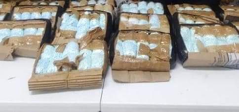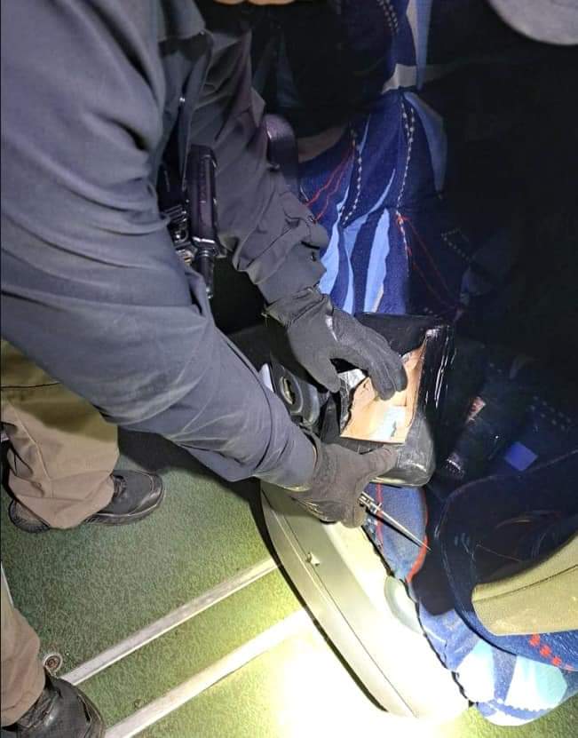 A la altura del kilómetro 93 200 de la Carretera Federal 1460, en inmediaciones del ejido Estación Luis, de Huatabampo, Sonora, los elementos de la Policía Federal Ministerial (PFM), de la AIC, detuvieron a Omar “R” y Aníbal “L”, a bordo de un autobús y al realizar la inspección de dicha unidad, encontraron 19 paquetes de forma rectangular, confeccionados en cinta negra, con tabletas de color azul, presentando en una de sus caras la letra M, al parecer fentanilo, con el peso aproximado referido, además de dos teléfonos celulares.