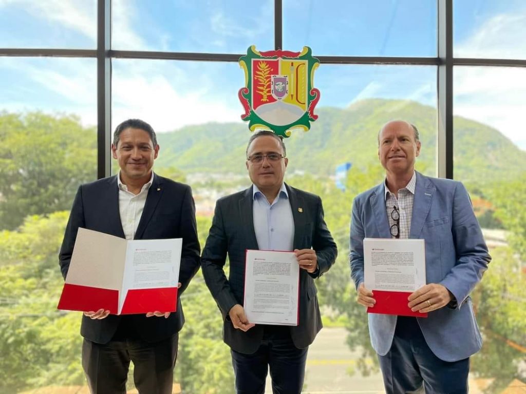 El secretario de Economía, Jesús Pérez López, en compañía del director general adjunto de Red Comercial de Santander México, Juan Villafuerte y el director regional BEI Occidente, Alejandro Romano Naya; llevaron a cabo la firma de un convenio de colaboración que beneficia a pequeñas y medianas empresas (PyMEs) en esta entidad con una oferta preferencial.