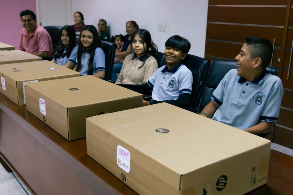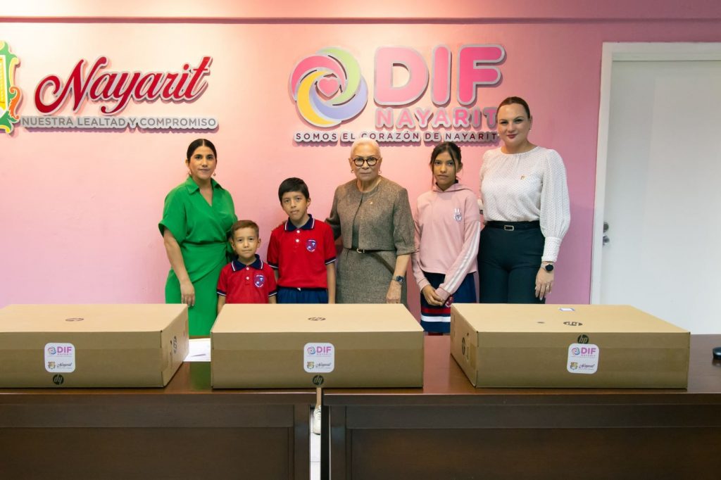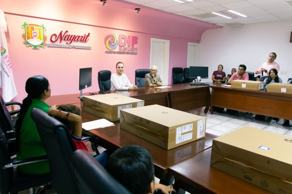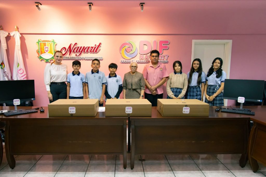 Como parte del compromiso permanente para impulsar el acceso a una educación de calidad, la presidenta del Sistema DIF Nayarit, doctora Beatriz Estrada Martínez, entregó 20 computadoras para la Primaria Emiliano Zapata y la Telesecundaria Juan Escutia, de Compostela y Xalisco, respectivamente, en beneficio directo de más de 130 estudiantes de ambos planteles.
