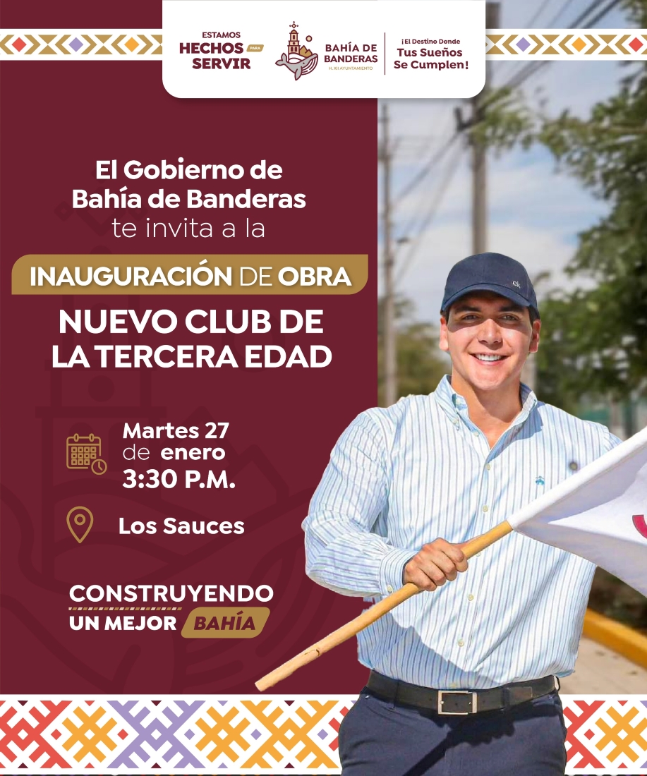 El Gobierno de Bahía de Banderas invita a la ciudadanía a la inauguración del Nuevo Club de la Tercera Edad, una obra pensada para fortalecer la convivencia, el bienestar y la atención de las personas adultas mayores del municipio.