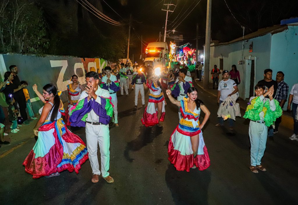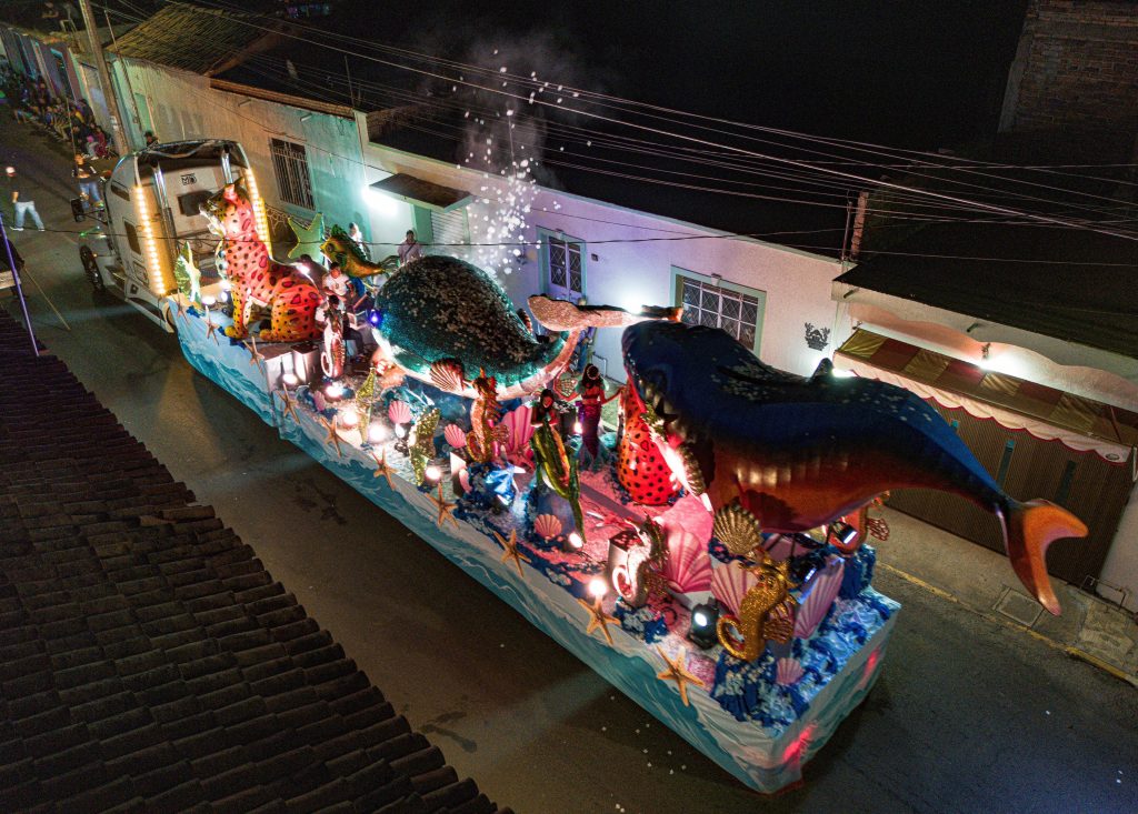 Detrás de la comparsa desfiló un imponente carro alegórico decorado con figuras representativas de la flora y la fauna del municipio, en el cual viajaba la reina de Bahía de Banderas, Keyla Arreola, quien saludó con entusiasmo a las familias de Santa María del Oro.