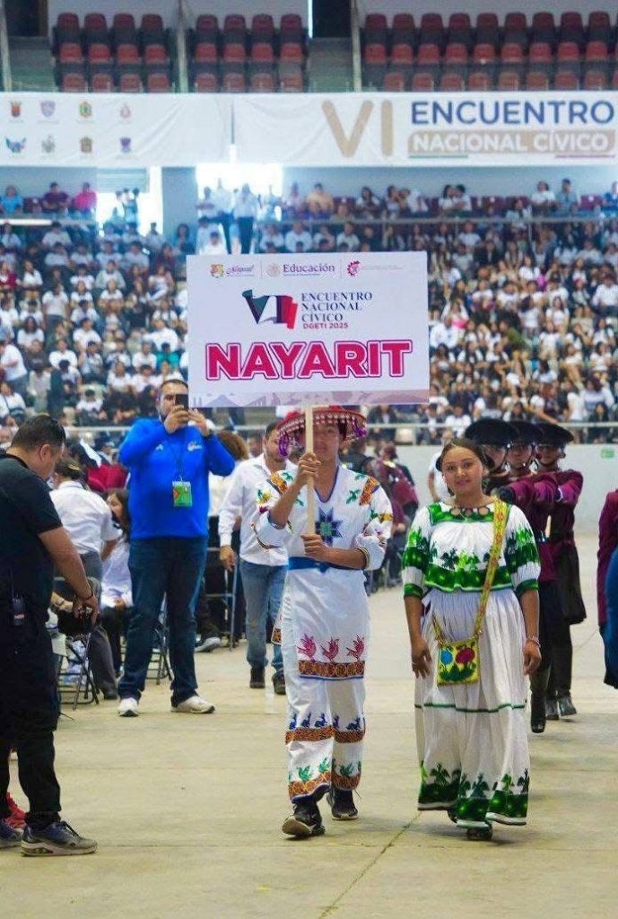 Este martes, el gobernador del estado de Nayarit, Miguel Ángel Navarro Quintero, inauguró el VI Encuentro Nacional Cívico de la DGETI 2025 en el Auditorio Amado Nervo de Tepic, acompañado por el titular de la DGETI, Rolando de Jesús López Saldaña. El evento reunió a mil 200 jóvenes de los 32 estados en disciplinas de Escolta, Banda de Guerra e Himno Nacional.