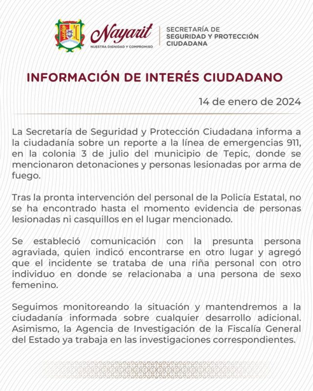 La Secretaría de Seguridad y Protección Ciudadana informa a la ciudadanía sobre un reporte a la línea de emergencias 911, en la colonia 3 de julio del municipio de Tepic, donde se mencionaron detonaciones y personas lesionadas por arma de fuego.