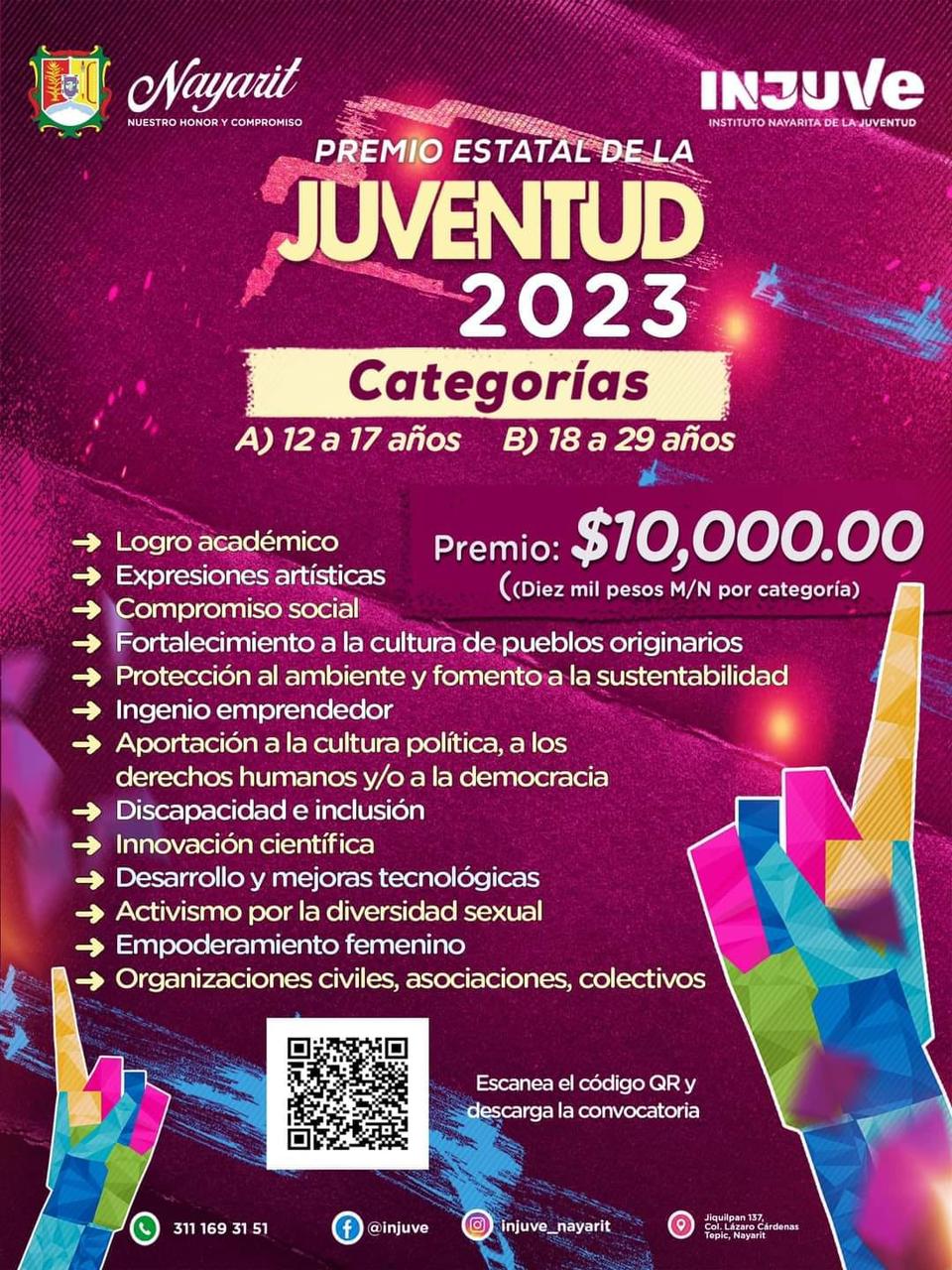 El Gobierno de Nayarit a través del Instituto Nayarita de la Juventud, invitan a todas las juventudes nayaritas a participar en el Premio Estatal de la Juventud 2023, la máxima distinción que otorga el gobierno del estado a jóvenes en reconocimiento a su talento, creatividad, trayectoria y destacada participación, cuya convocatoria se cierra hoy lunes 20 de noviembre.