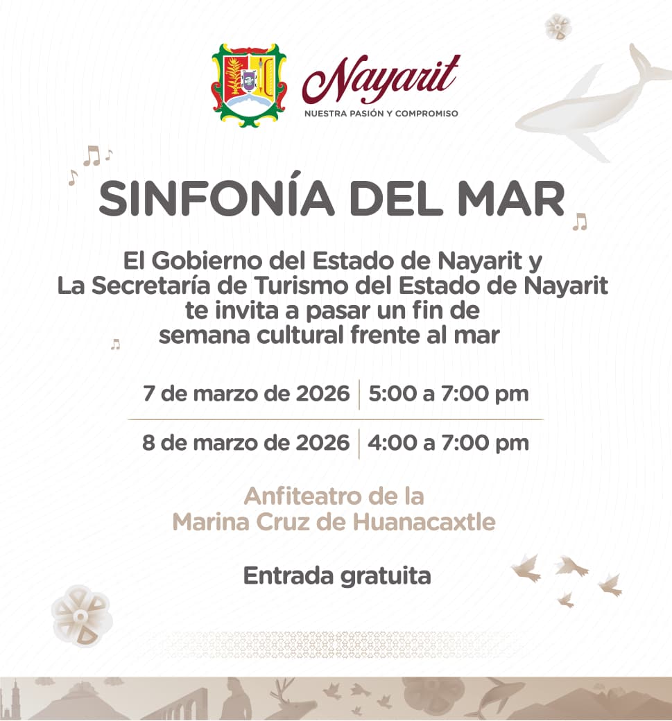 El Gobierno del Estado de Nayarit, a través de la Secretaría de Turismo, invita a las familias nayaritas y visitantes a disfrutar de “Sinfonía del Mar”, un evento cultural gratuito que se llevará a cabo los días 7 y 8 de marzo en el Anfiteatro de la Marina de la Cruz de Huanacaxtle, en Bahía de Banderas.