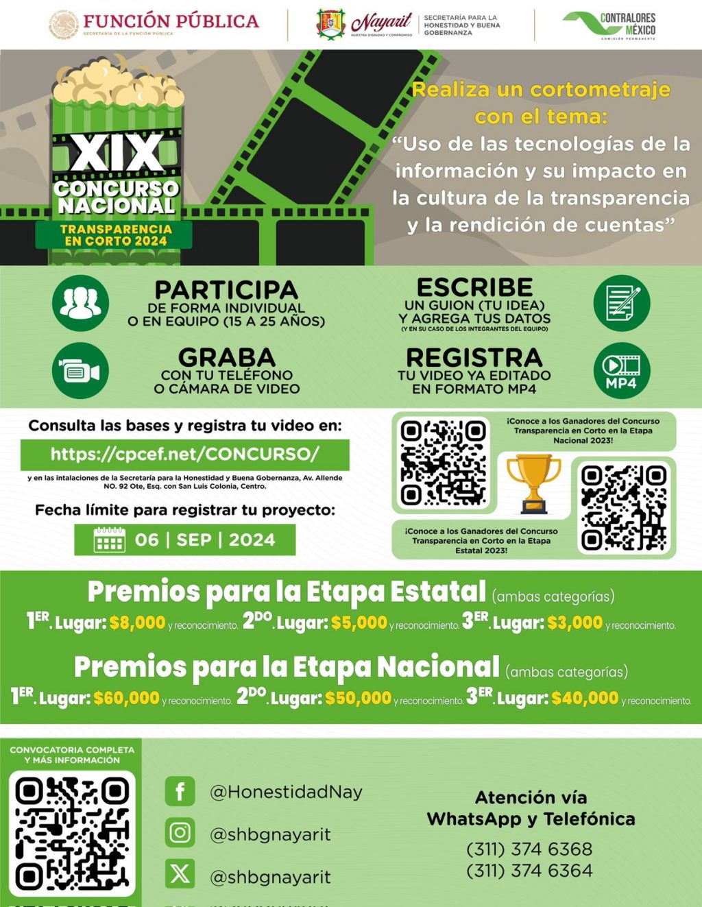 La convocatoria estará abierta hasta el 06 de septiembre de 2024 y las bases las pueden consultar en la siguiente liga: https://contraloria.nayarit.gob.mx/assets/pdf/convocatorias/transparencia%20en%20corto%202024.pdf