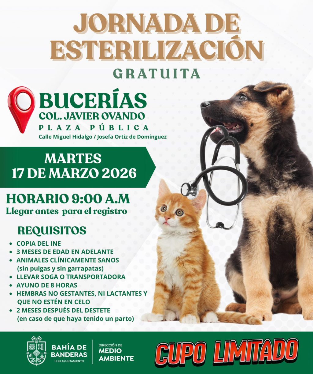El H. XII Ayuntamiento de Bahía de Banderas, a través de la Dirección de Medio Ambiente, llevará a cabo una Jornada de Esterilización Gratuita para perros y gatos en la colonia Javier Ovando, en Bucerías, esto con el objetivo de fomentar la tenencia responsable de mascotas y contribuir al control de la sobrepoblación animal.