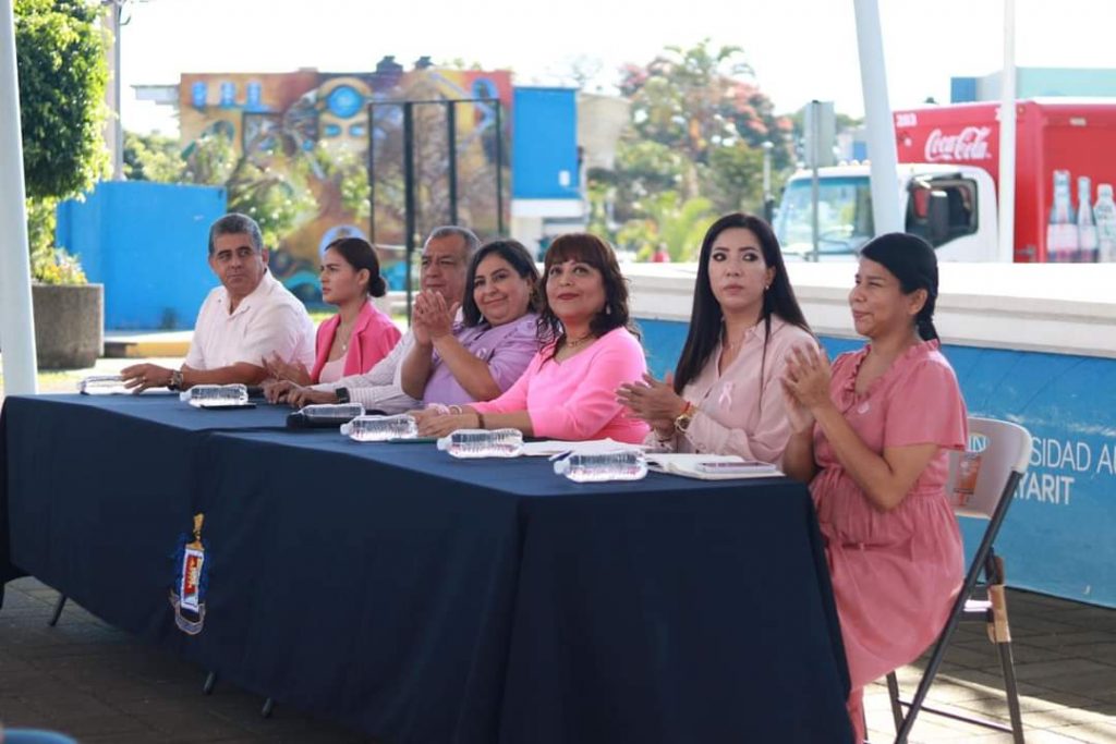 El acto protocolario fue encabezado por la Secretaria de Extensión y Vinculación, la maestra Teresa Aidé Iniesta Ramírez, la Directora de Vinculación y responsabilidad Social, la maestra Guadalupe González Arciniega, la Directora de Comunicación Institucional, la Dra. Dalinda Sandoval Acosta, así como la Titular del departamento cáncer uterino y cáncer mamario de los Servicios de Salud de Nayarit, la Dra. Amarante Rodríguez Mejía, en esta jornada se contó con conferencias enfocadas a la detección y atención oportuna, exposición sobre autoexploración, nutrición enfocada a pacientes con cáncer, así como espacio de exploración mamaria por parte de personal del área de la salud tanto de la Universidad Autónoma de Nayarit, como de los Servicios de Salud del Estado.